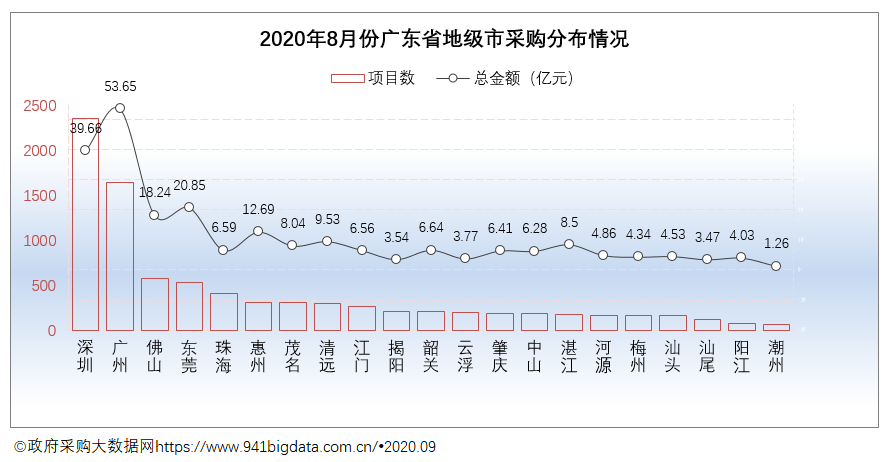 在全国31省(自治区、直辖市)中,2020年8月份广东政府采购项目数量与项目规模均排在全国第二。