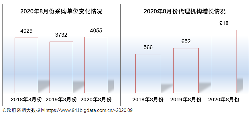 2020年8月份广东省政府采购有采购单位4055家,较上年同比增加323家,增幅为8.65%。从近三年8月份数据来看,采购单位数保持相对稳定的趋势。