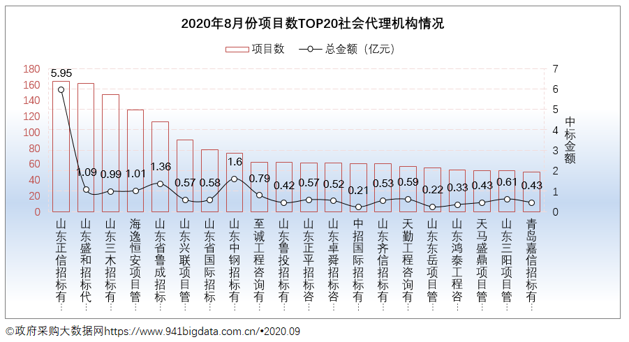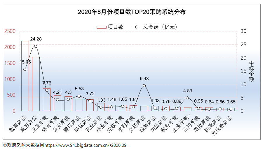 从项目数TOP20采购系统来看,2020年8月份山东省政府采购教育系统项目数最为突出,具体来看前三采购系统: