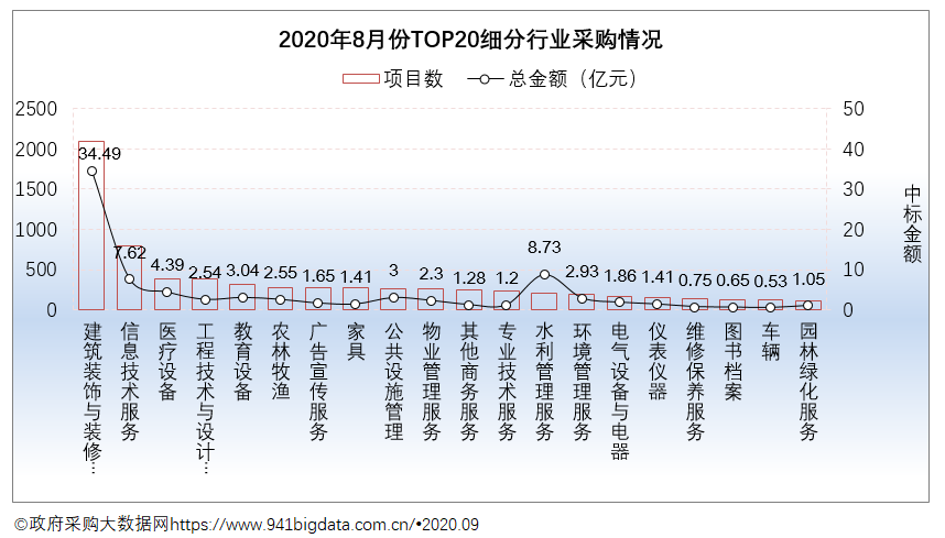 从项目数TOP20采购细分行业来看,2020年8月份山东省政府采购细分行业排在前三的是:建筑装饰与装修服务、信息技术服务、医疗设备。