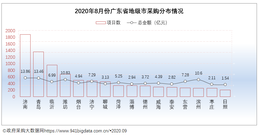 济南市采购项目数1883个,占项目总数的20.60%,项目金额13.86亿元,占项目总规模的13.19%;