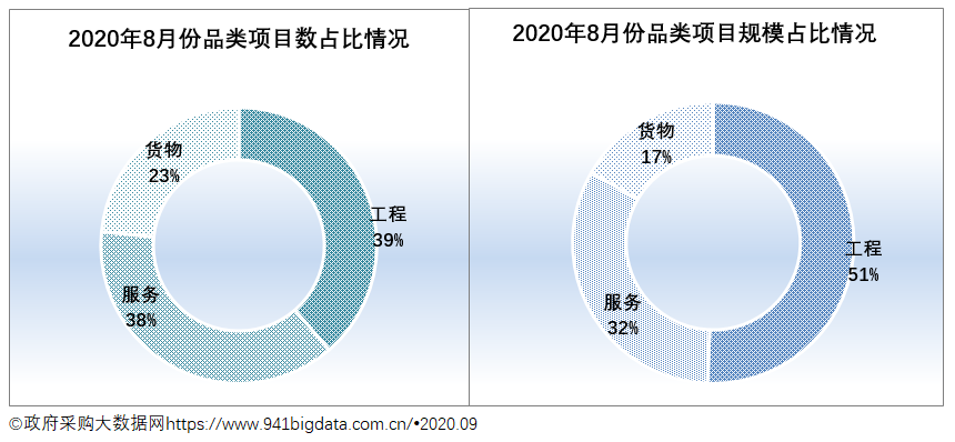 从项目采购结构来看,2020年8月份山东政府采购工程类采购规模占主导。具体来看: