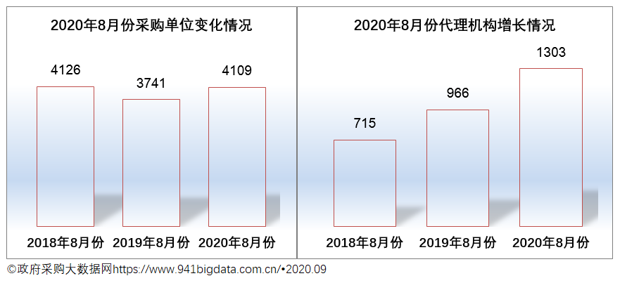2020年8月份山东省政府采购有采购单位4109家,较去年同比增加368家,增幅为9.84%。从近三年8月份的数据来看,采购单位数呈现出相对较稳定的趋势。