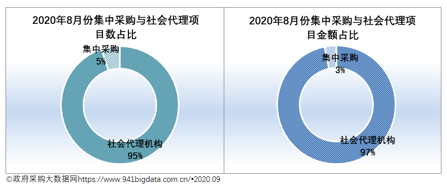 2020年8月份山东集中采购代理机构22家,占比1.69%;代理项目数465个,占项目总数的5.09%,代理项目金额3.36亿元,占项目总规模的3.20%。