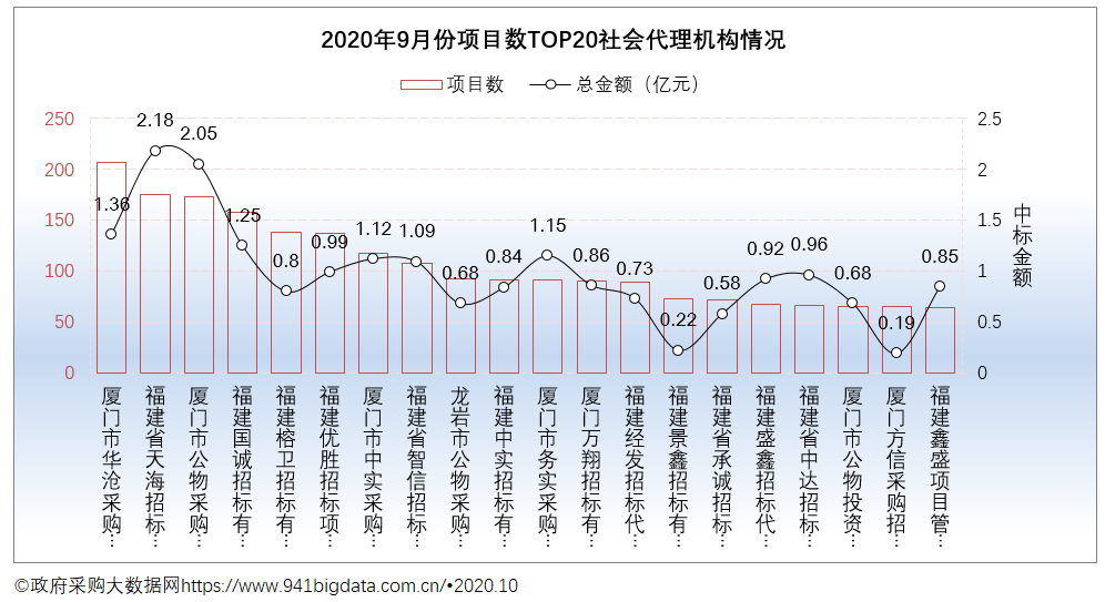 厦门市公物采购招投标有限公司采购项目数173个,占项目总数的2.63%,项目金额2.05亿元,占项目总规模的0.98%;