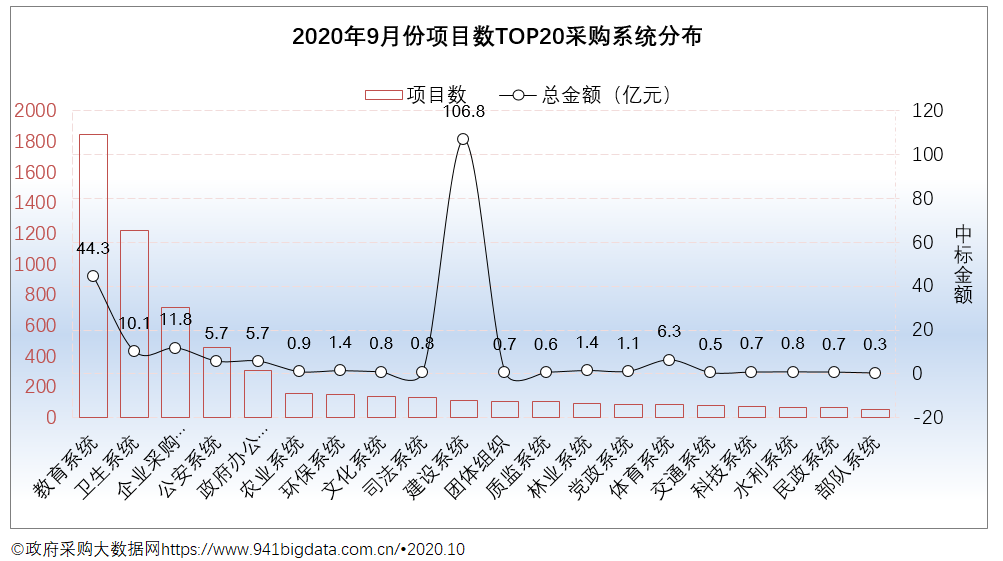 从项目数TOP20采购系统来看,2020年9月份福建省政府采购教育系统项目数最为突出,具体来看前三采购系统: