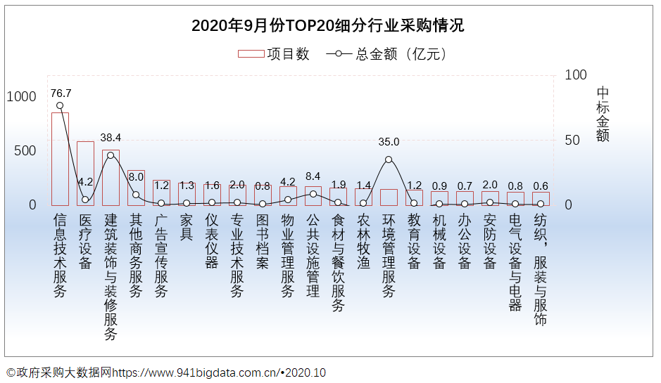 从项目数TOP20采购细分行业来看,2020年9月份福建省政府采购细分行业排在前三的是:信息技术服务、医疗设备、建筑装饰与装修服务。具体来看: