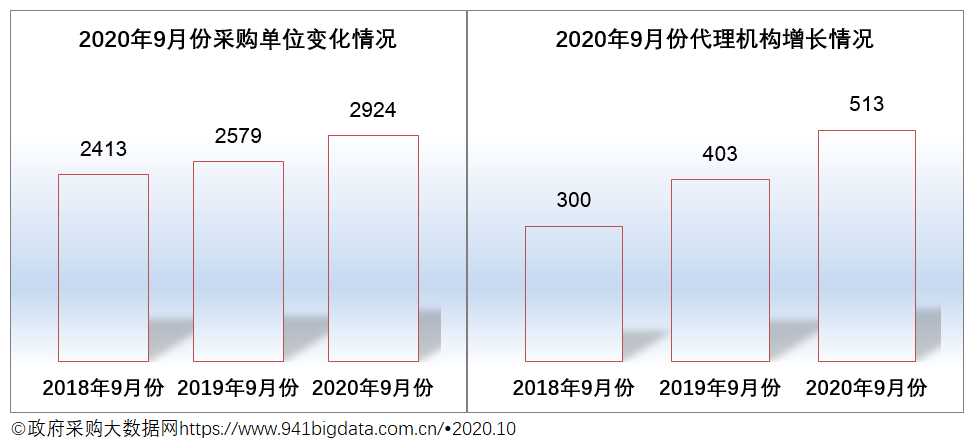 2020年9月份福建省政府采购有代理机构513家,较去年同比增加110家,增幅27.3%。从近三年9月份的数据来看,福建省政府采购代理机构市场发展迅速,可见,市场竞争压力逐年增加。