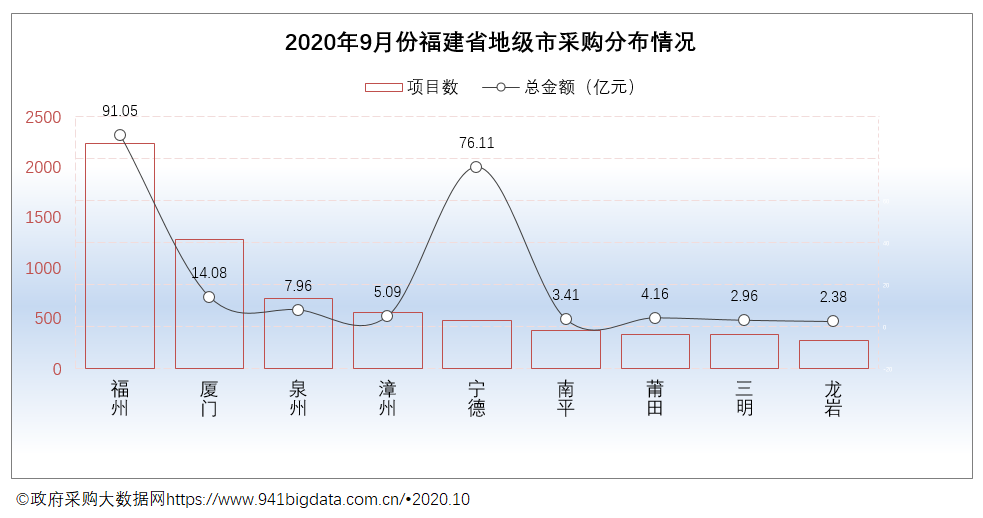 其中福州市采购项目数2235个,占项目总数的33.00%,项目金额91.05亿元,占项目总规模的43.35%;