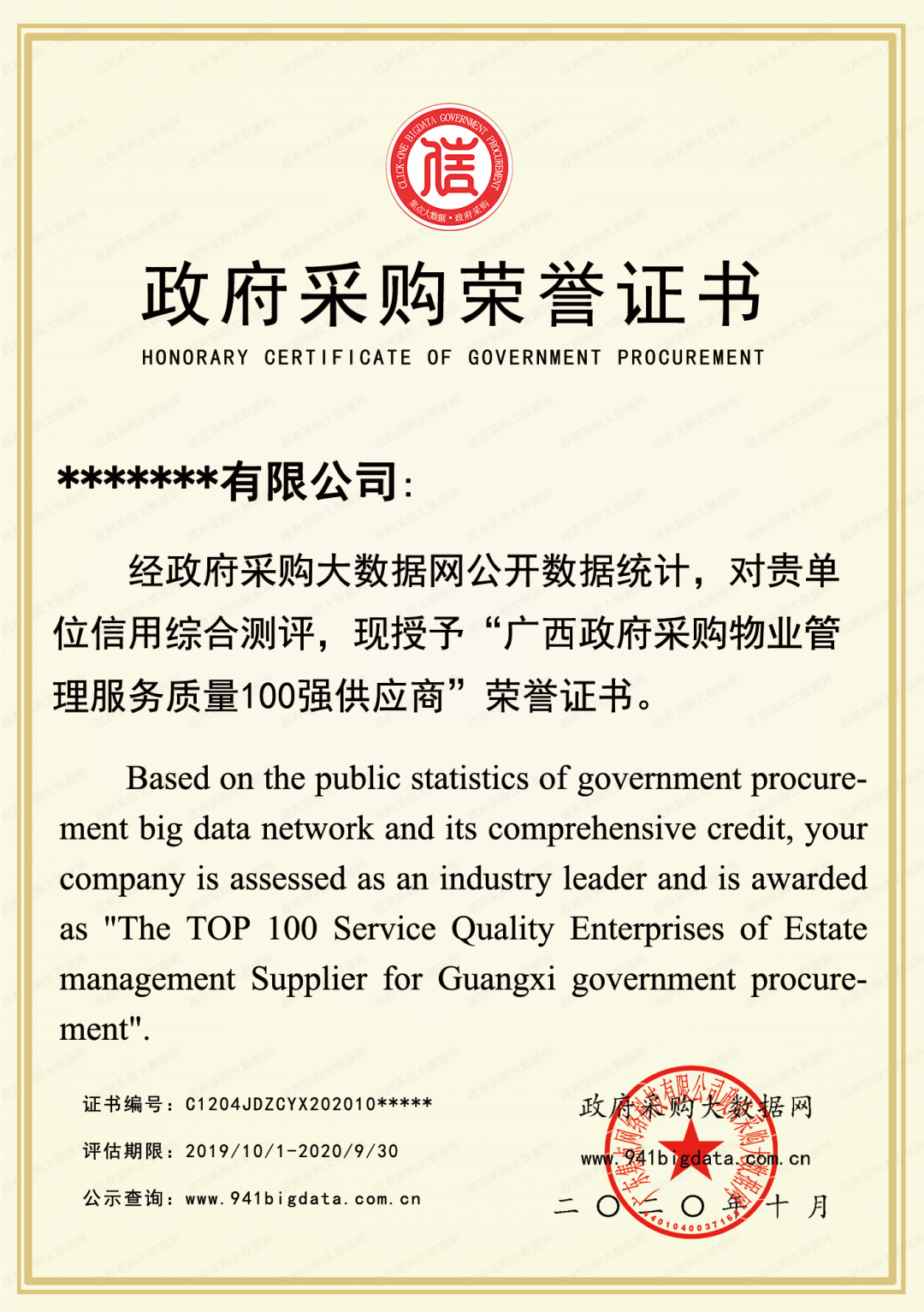 政府采购大数据网可出具荣誉证书(包含信用报告&证书&牌匾)。解释权归政府采购大数据研究院所有。
