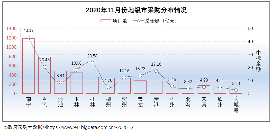从2020年11月份广西地级市政府采购项目数分布来看,南宁市项目数位居第一,其次是百色市和河池市。具体来看: