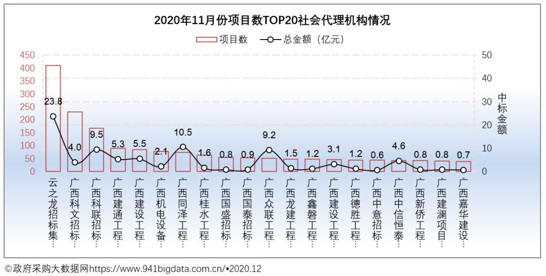 从项目数TOP20社会代理机构来看,云之龙招标集团有限公司在项目数量和项目金额上均占据优势,具体来看: