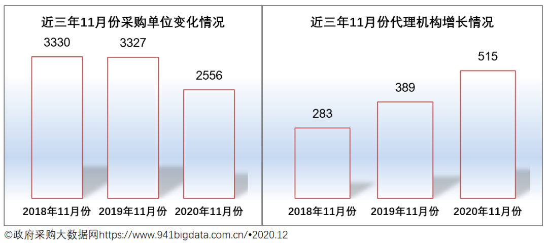 2020年11月份广西政府采购市场有代理机构515家,较去年同比增加了126家;增幅32.39%。从近三年11月份的数据来看,广西政府采购代理机构市场发展迅速,可见,市场竞争压力逐年增大。