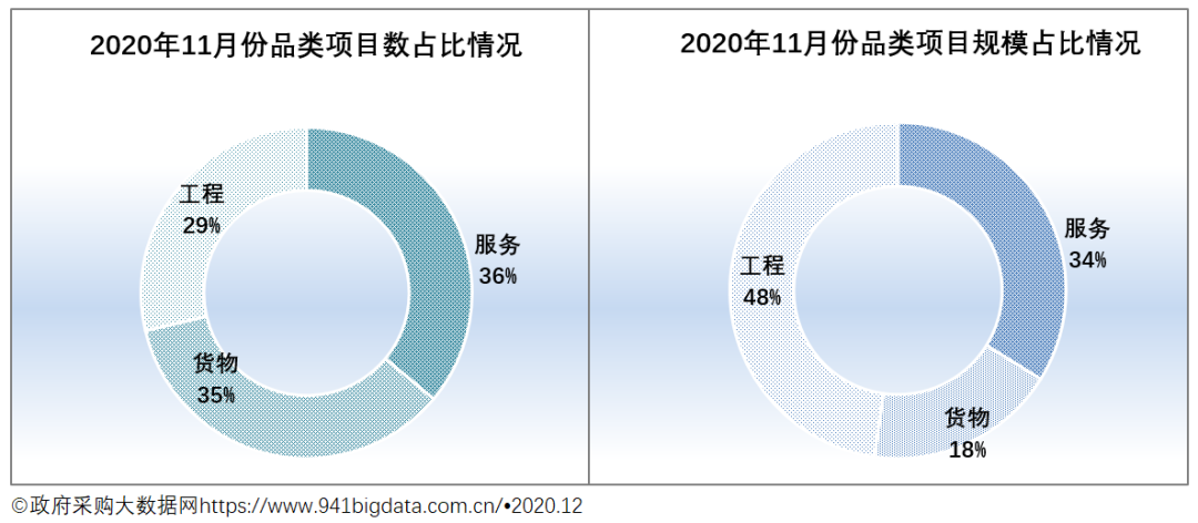 从项目采购结构来看,2020年11月份广西政府采购工程类采购规模占主导。具体来看: