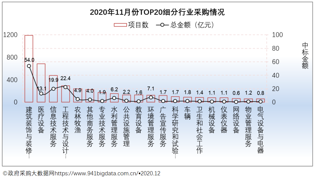 从项目数TOP20采购细分行业来看,2020年11月份广西政府采购排在前三的行业有建筑装饰与装修服务、医疗设备、信息技术服务。