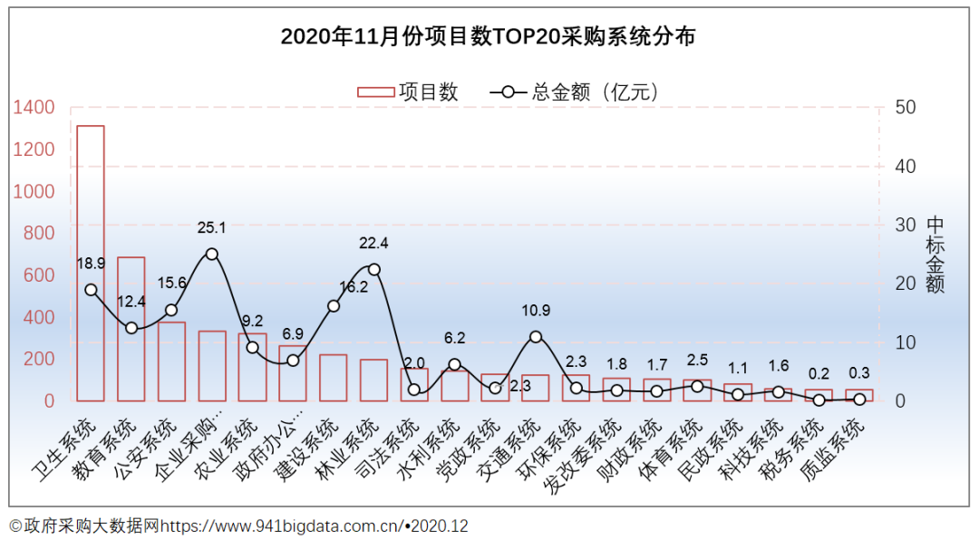 从项目数TOP20采购系统来看:2020年11月份广西政府采购卫生系统项目数最为突出,共计1311个,占项目总数的23.58%,项目规模18.94亿元,占项目总规模的10.36%;