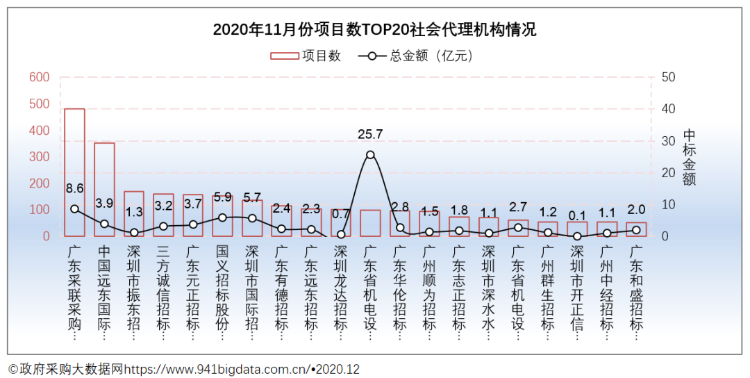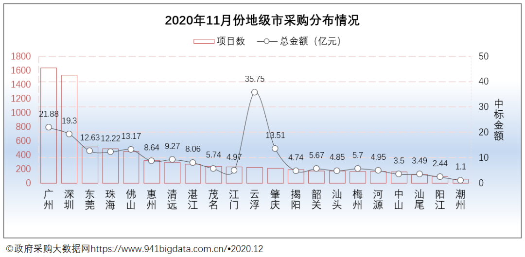 在全国31省(自治区、直辖市)中,2020年11月份广东省政府采购项目数量位居第二,项目金额位居首位。