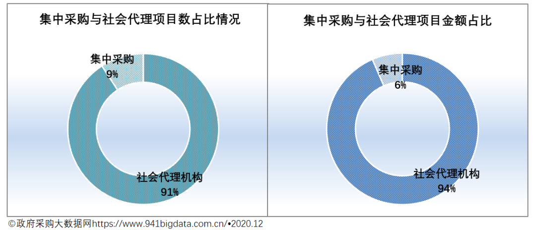 从代理机构性质来看,2020年11月份广东政府采购社会代理机构884家,占比95.26%;代理项目数7146个,占项目总数的90.78%,代理项目金额351.24亿元,占项目总规模的93.51%。