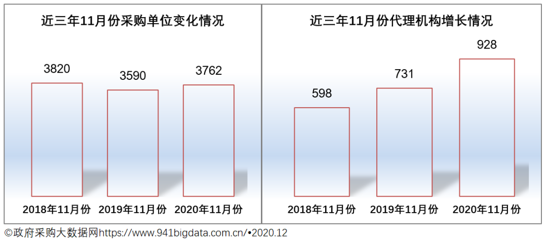 2020年11月份广东政府采购市场有代理机构928家,较去年同比增加了197家;增幅26.95%。从近三年11月份数据来看,代理机构市场发展迅速,可见,市场竞争压力逐年增加。