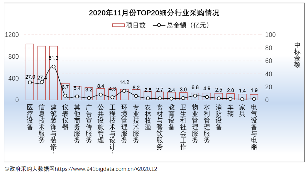从项目数TOP20采购细分行业来看,2020年11月份广东政府采购排在前三的行业有医疗设备、信息技术服务、建筑装饰与装修服务。