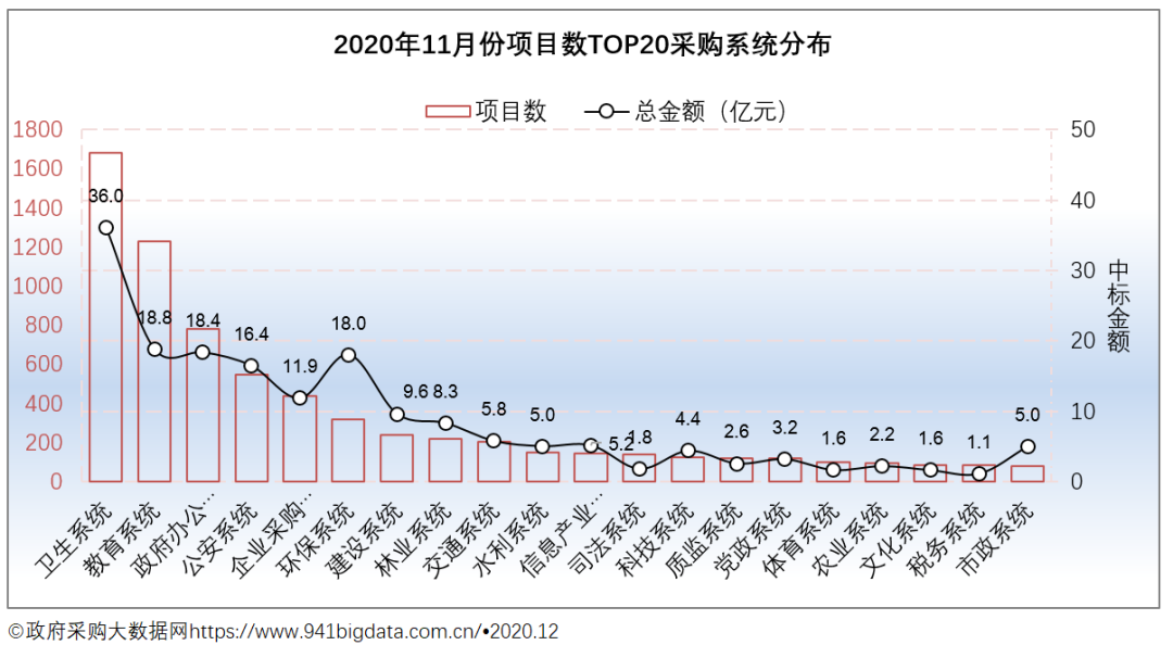 从项目数TOP20采购系统来看:2020年11月份广东政府采购卫生系统项目数最为突出,共计1680个,占项目总数的21.34%,项目规模36.04亿元,占项目总规模的17.22%;