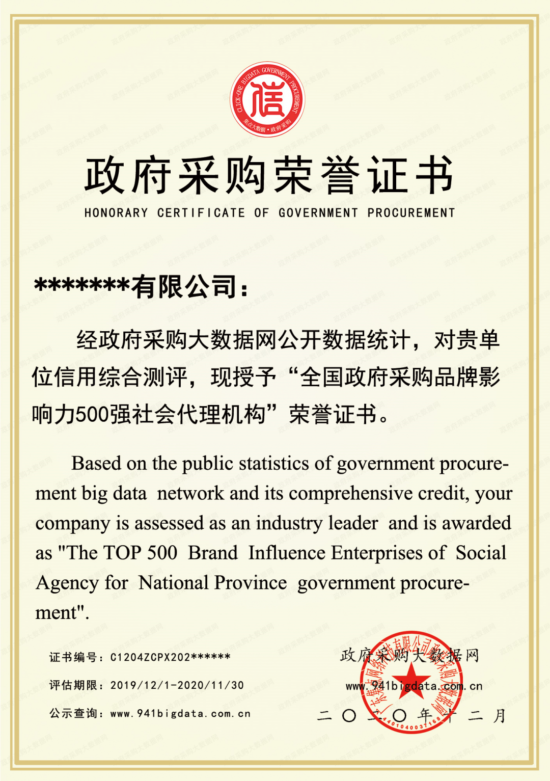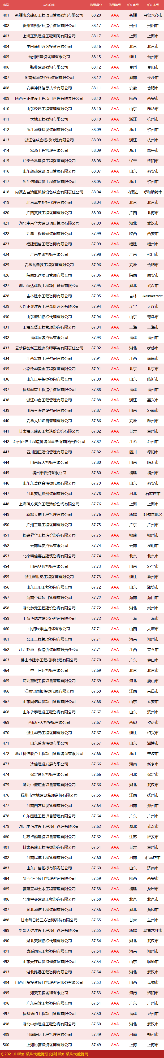 政府采购大数据研究院和政府采购大数据网联合发布:全国政府采购社会代理机构品牌影响力500强榜单。评估时段为:2019年12月01日至2020年11月30日。公示日期为:2021年01月21日至2021年01月27日。