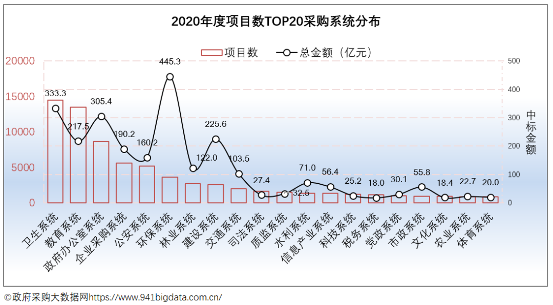 从项目数TOP20采购系统来看:2020年广东政府采购卫生系统项目数最为突出,共计14459个,占项目总数的17.72%,项目规模333.32亿元,占项目总规模的11.70%;