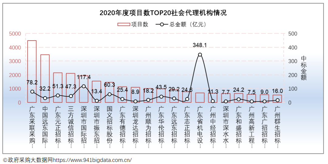 从项目数TOP20社会代理机构来看,广东采联采购科技有限公司在项目数量上占据优势,广东省机电设备招标有限公司在项目金额上更具竞争力。