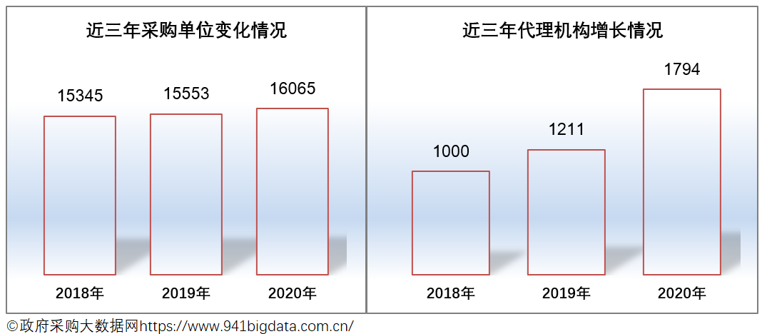 2020年广东政府采购市场有采购单位16065家,较去年同比增加512家,增幅为3.29%。从近三年数据来看,采购单位数呈稳定增长趋势。