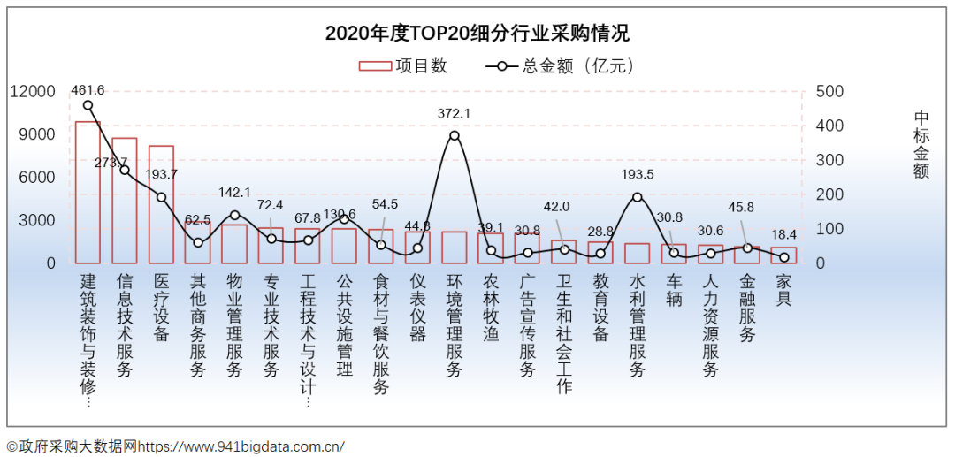 从项目数TOP20采购细分行业来看,2020年广东政府采购排在前三的行业有建筑装饰与装修服务、信息技术服务、医疗设备。