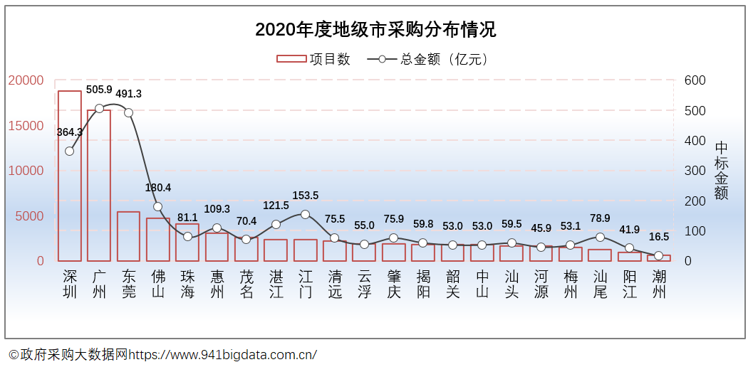 从地级市政府采购项目数分布来看,2020年度广东省政府采购项目数高度集中于一线城市,具体来看项目数排前三地区: