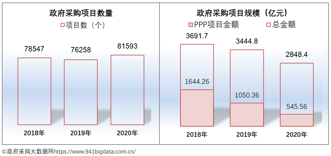 2020年广东政府采购项目数81593个,与去年同比增长7.00%;项目规模为2848.39亿元,同比下降17.31%。