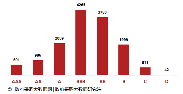 从福建省政府采购服务质量信用等级分布可见,信用等级AAA级共有691家,占总体样本的4.81%。A级及以上信用等级单位3766家,占总体样本的26.22%。B级及以上信用等级单位13812家,占总体样本的96.15%。数据显示,福建省政府采购服务质量信用状况整体上表现良好。