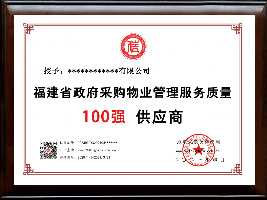 政府采购大数据网可出具荣誉证书(包含荣誉牌匾&荣誉证书&大数据信用报告)。解释权归政府采购大数据研究院所有。