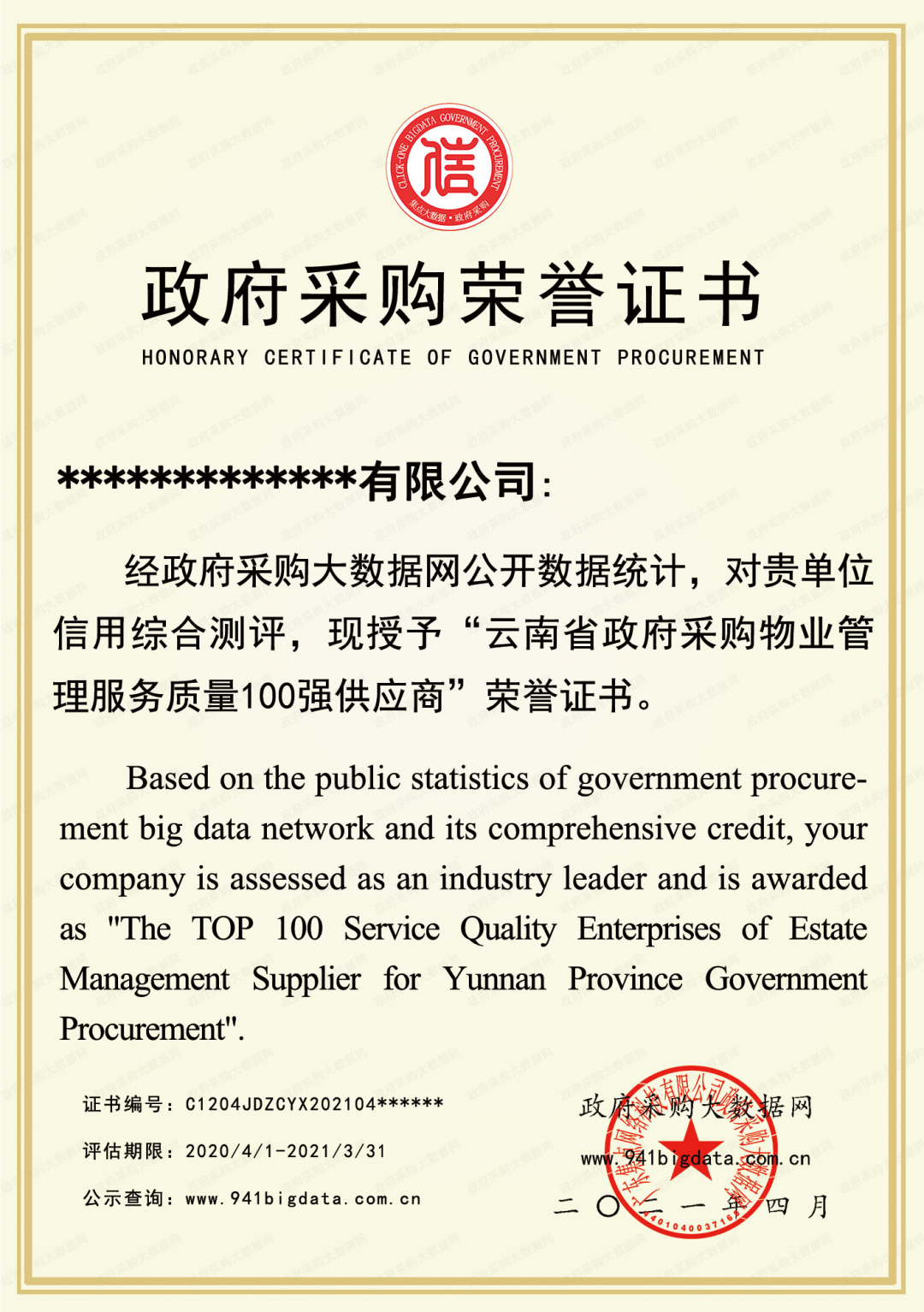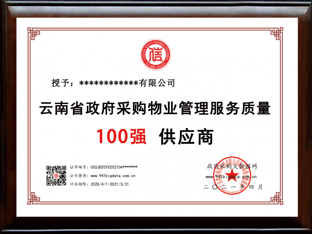 政府采购大数据网可出具荣誉证书(包含荣誉牌匾&荣誉证书&大数据信用报告)。解释权归政府采购大数据研究院所有。