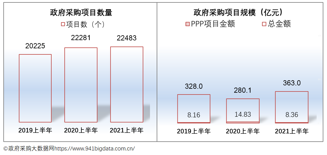2021上半年福建政府采购项目数22483个,与去年同比增长0.91%;项目规模为363.04亿元,同比增长29.61%。