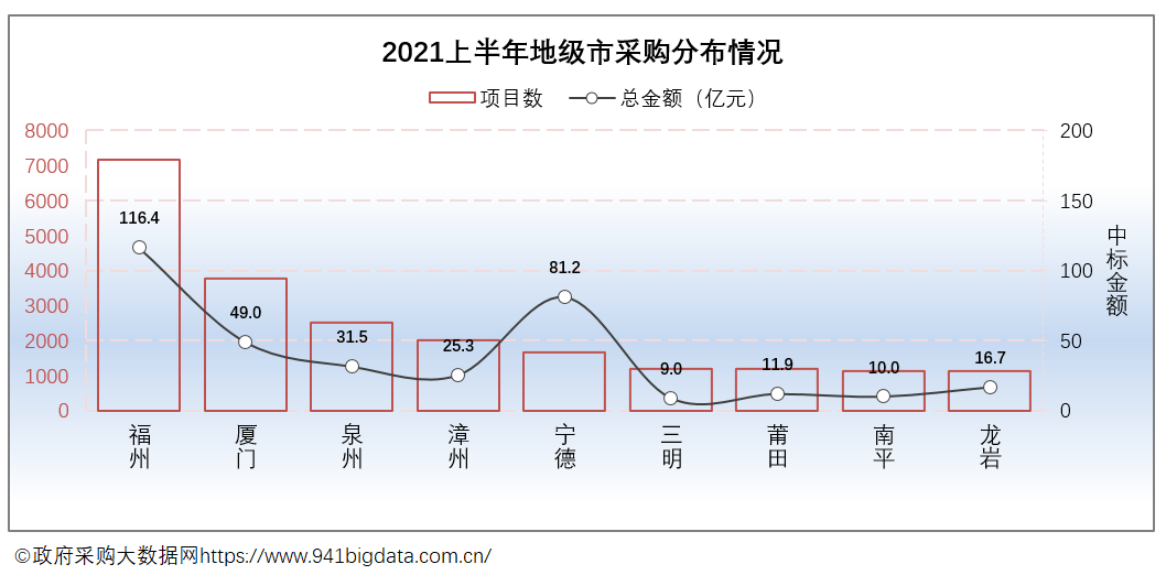 福州市采购项目数7158个,占项目总数的31.84%,项目金额116.41亿元,占项目总规模的32.07%;