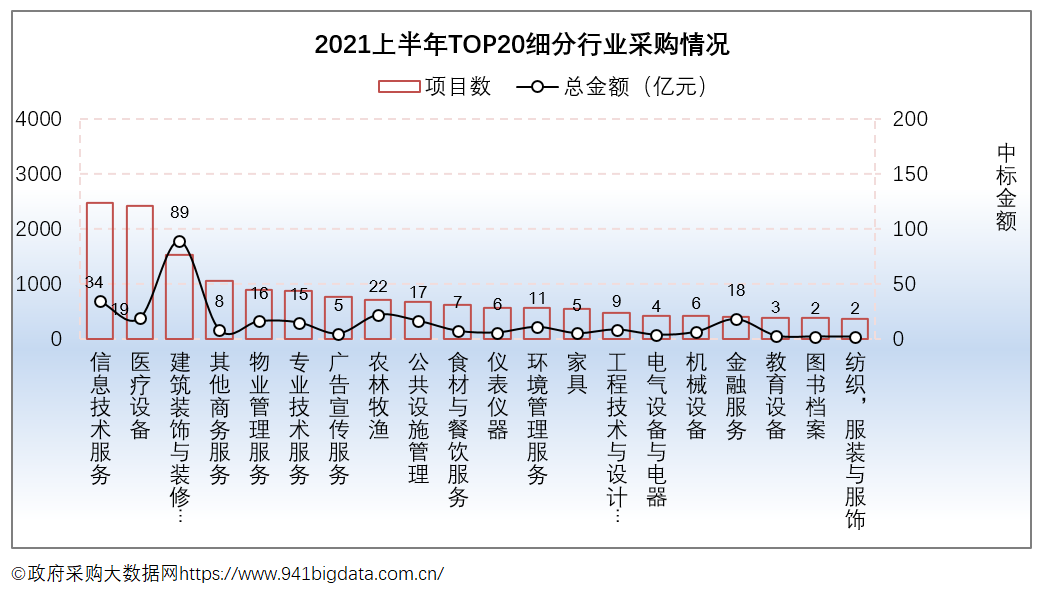从项目数TOP20采购细分行业来看,2021上半年福建政府采购排在前三的行业有信息技术服务、医疗设备、建筑装饰与装修服务。