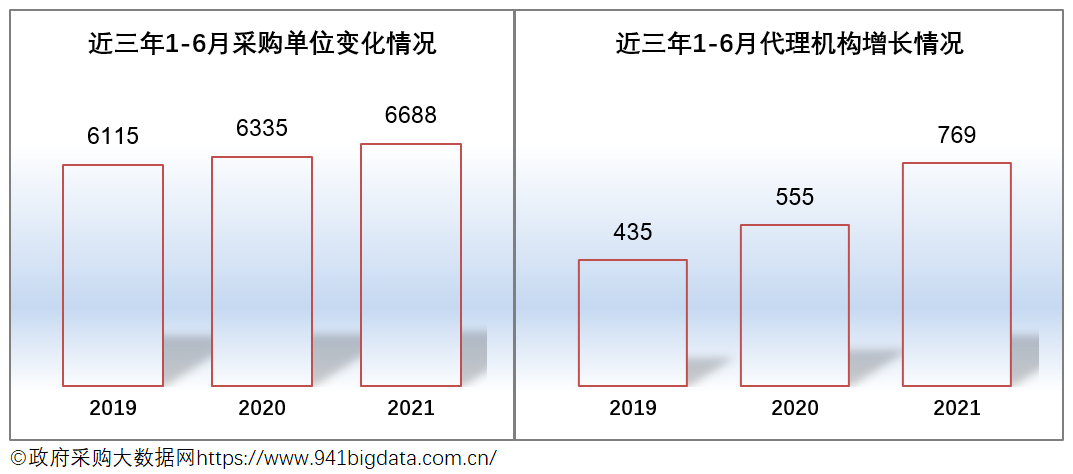 2021上半年福建政府采购市场有代理机构769家,较去年同比增加了214家,增幅达38.56%。从近三年数据来看,代理机构市场发展迅快速,市场竞争压力也在不断增加。