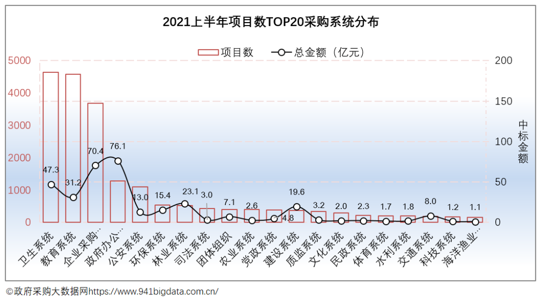 从项目数TOP20采购系统来看:2021上半年福建政府采购卫生系统项目数最为突出,共计4634个,占项目总数的20.61%,项目规模47.29亿元,占项目总规模的13.03%;