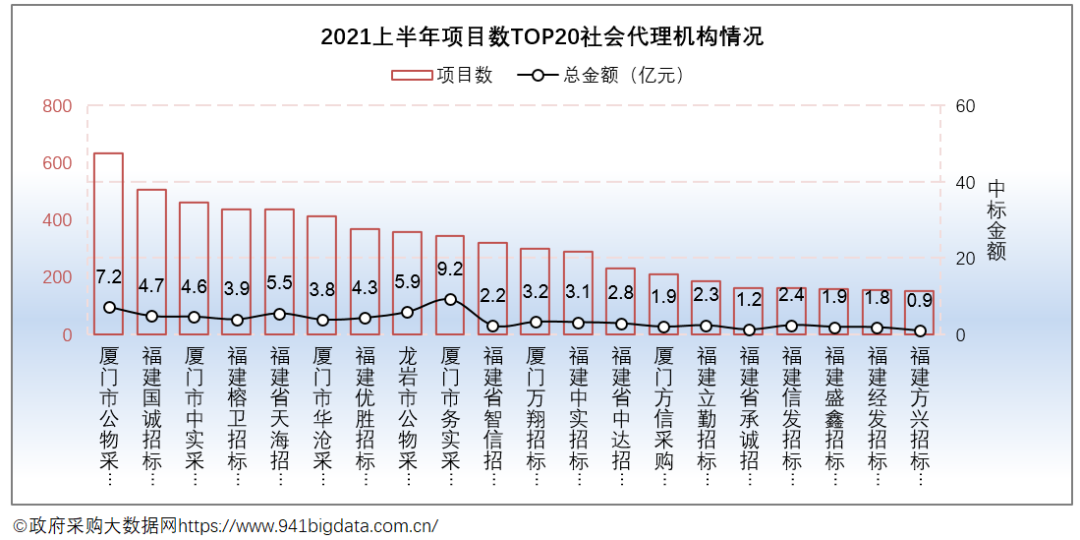 从项目数TOP20社会代理机构来看,厦门市公物采购招投标有限公司在项目数量上更具竞争力,厦门市务实采购有限公司在项目金额上占优势。