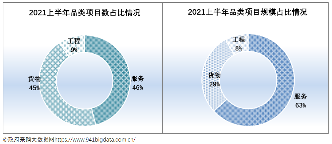 从项目采购结构来看,2021上半年福建政府采购服务类项目规模占主导。具体来看:服务类采购项目数10353个,占项目总数的46.08%,项目规模229.81亿元,占项目总规模的63.32%;