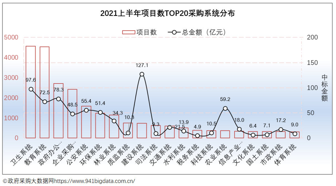 从项目数TOP20采购系统来看:2021上半年广东政府采购卫生系统项目数最为突出,共计4563个,占项目总数的16.23%,项目规模97.6亿元,占项目总规模的11.54%;