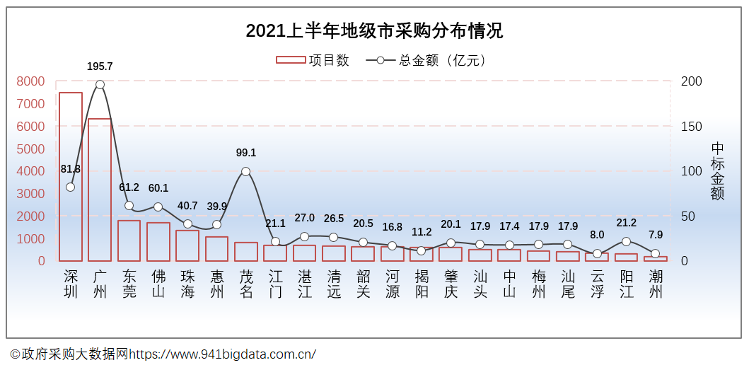 从地级市项目数分布来看,2021上半年广东政府采购项目数高度集中于一线城市,具体来看项目数排前三地区: