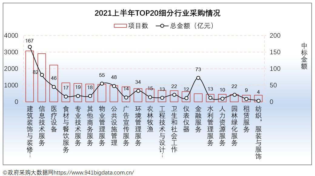 从项目数TOP20采购细分行业来看,2021上半年广东政府采购排在前三的行业有建筑装饰与装修服务、信息技术服务、医疗设备。