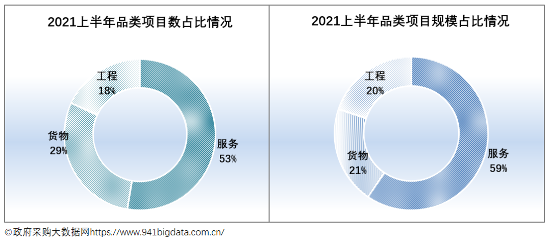 从项目采购结构来看,2021上半年广东政府采购服务类项目规模占主导。具体来看:服务类采购项目数14493个,占项目总数的52.71%,项目规模502.27亿元,占项目总规模的59.54%;