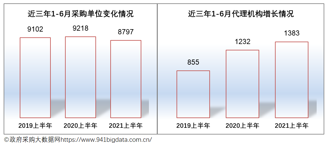 2021上半年广东政府采购市场有代理机构1383家,较去年同比增加了151家,增幅达12.26%。从近三年数据来看,代理机构市场发展相对较快,市场竞争压力也在逐年增加。