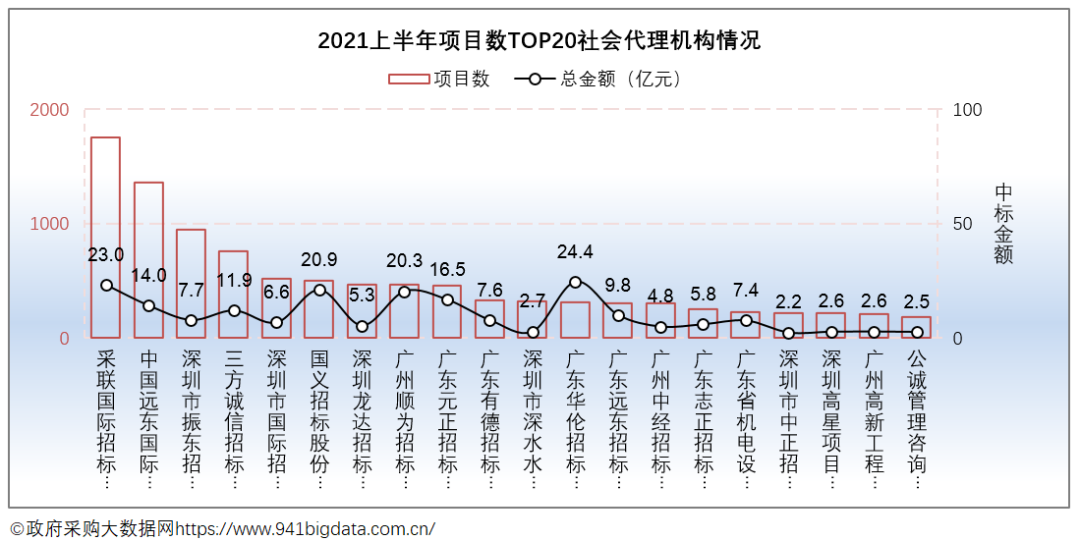 项目数TOP20社会代理机构中采联国际招标采购集团有限公司在项目数量上更具竞争优势,广东华伦招标有限公司在项目规模上更胜一筹。