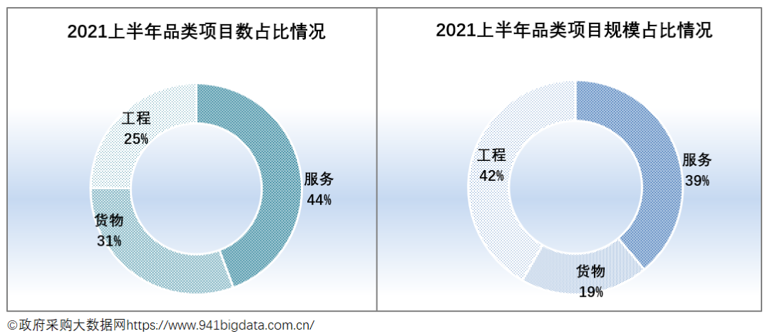 从项目采购结构来看,2021上半年全国政府采购服务类项目数量占主导。具体来看: