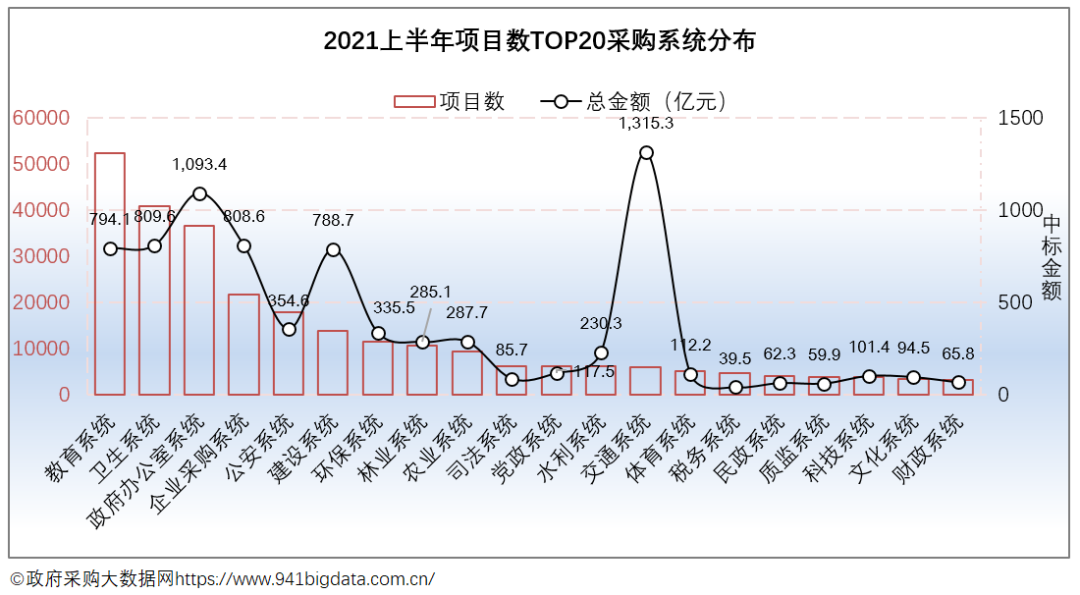 从项目数TOP20采购系统来看:2021上半年全国政府采购教育系统项目数最为突出,共计52423个,占项目总数的16.69%,项目规模794.14亿元,占项目总规模的9.08%;